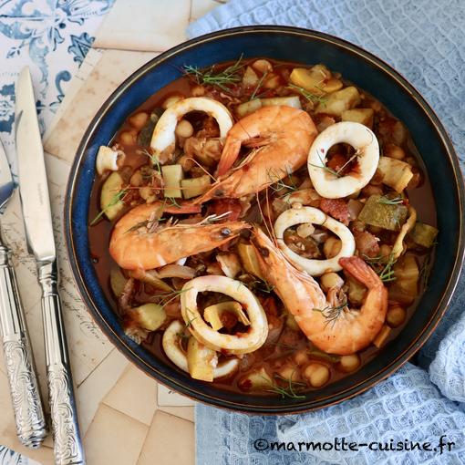 Ragoût de calamars, crevettes, pois chiches et ‘nduja (Tentacules !)