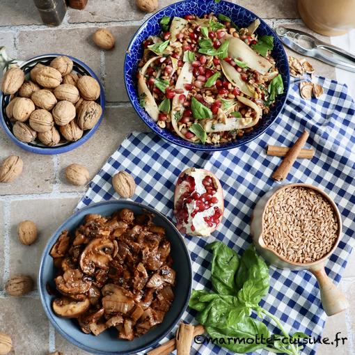 Salade d’épeautre aux endives grillées et à la grenade et Manitaria stifodo, le ragout de champignons au vin rouge (Temps de Carême #2)