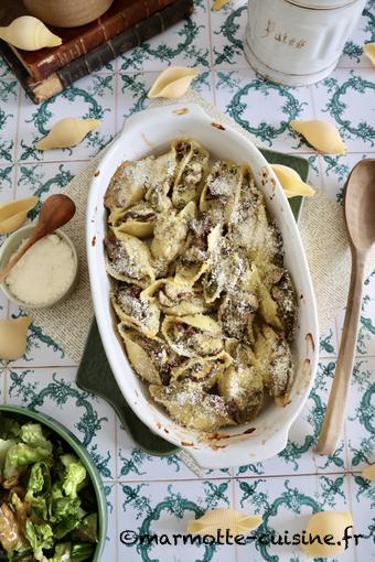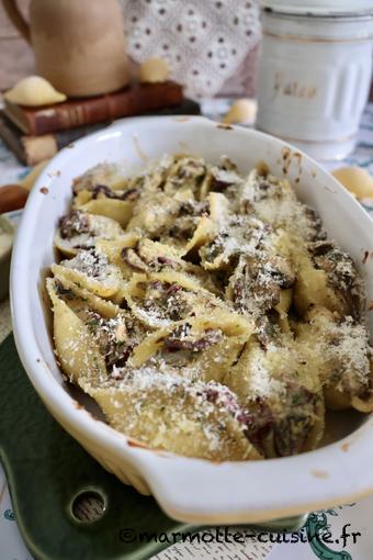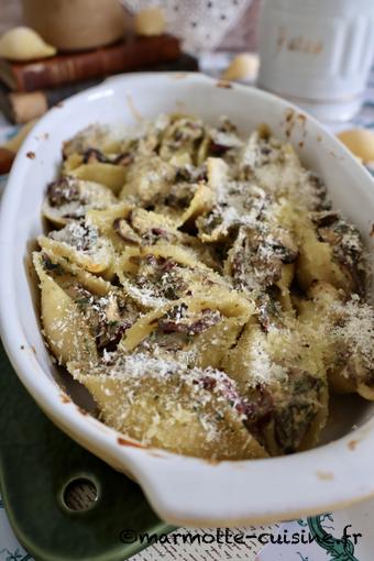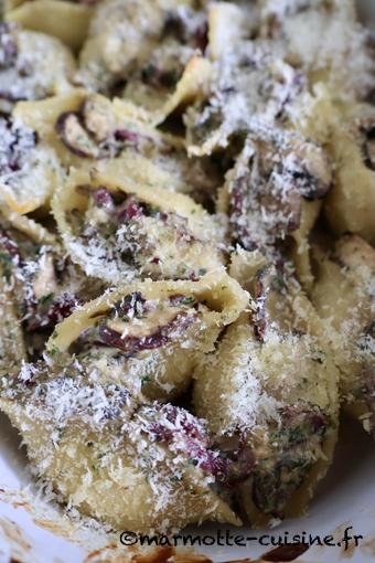 Les conchiglioni sont mes pâtes farcies préférées car je les trouve très belles et amusantes à préparer. C’est cela qui m’a donné envie de tester cette recette et c’était délicieux, à la fois bien crémeux grâce au fromage frais et à la crème et savoureux avec les gésiers et les champignons. Je vous recommande cette recette car en plus c’est une façon très originale de cuisiner les gésiers.