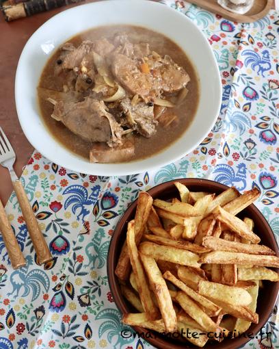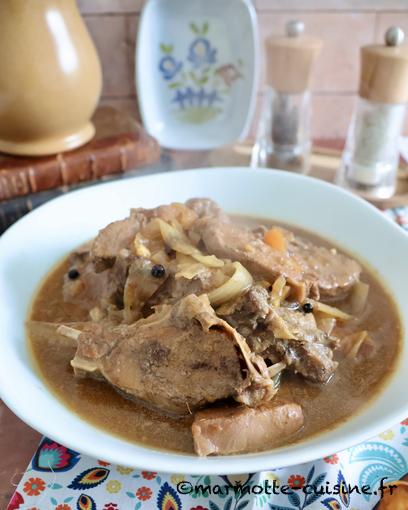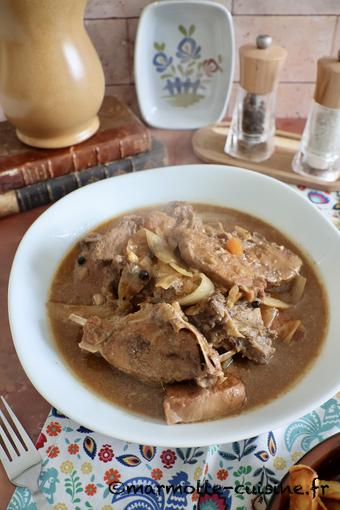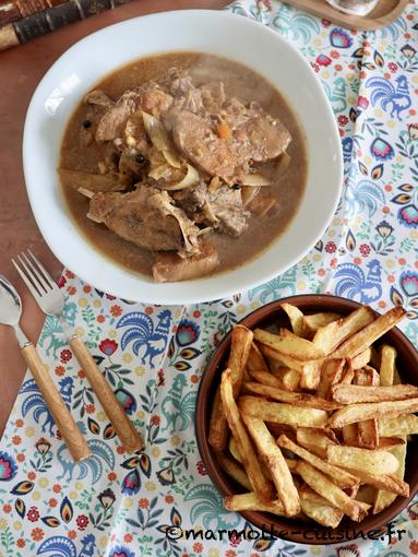 J’avais des côtelettes de sanglier dans mon congélateur mais je n’arrivais pas à trouver une recette que me plaisait, car pour une fois je ne voulais pas faire du gibier avec du vin rouge. Je ne sais plus vraiment comment j’en suis arrivée à l’idée de faire une carbonade avec du sanglier mais ce que je peux vous dire, c’est que c’est délicieux. La viande grâce à la marinade et à la cuisson longue est très fondante, se détache toute seule et est très parfumée.