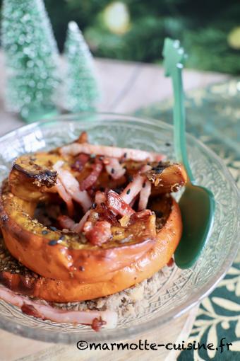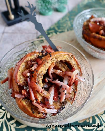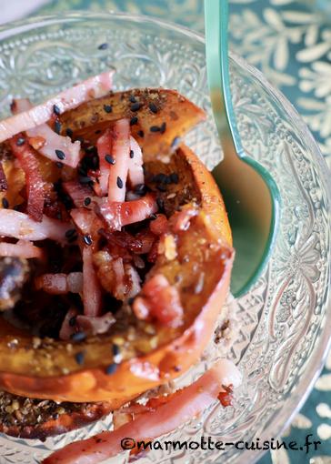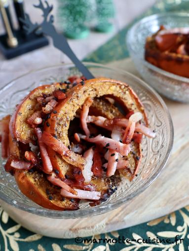 Tranches de potimarron rôties au sirop d’érable et mélasse de grenade, lardons de speck sur houmous de châtaignes (Calendrier de l’Avent salé : Case 10)