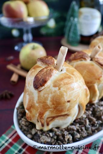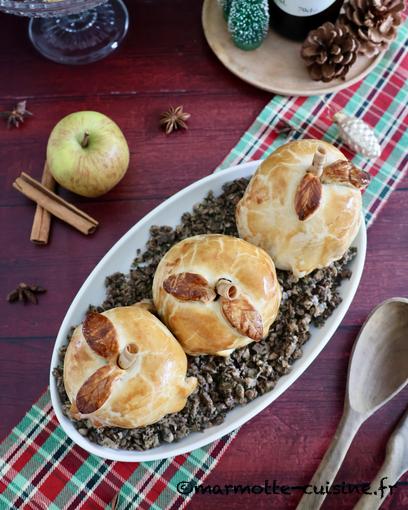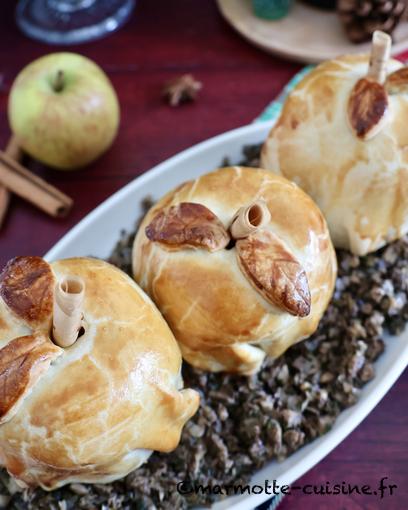 9/ Dresser les assiettes. Déposer un quart de duxelles dans une assiette puis déposer une pomme en croûte.