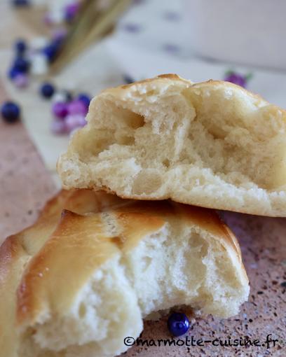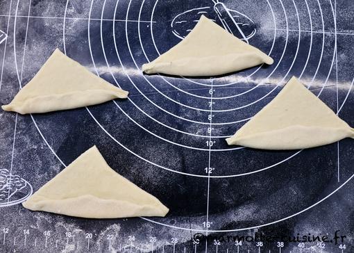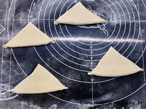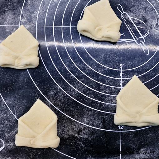 2/ Fariner un plan de travail et dégazer rapidement la pâte avant de la diviser en six pâtons égaux. Prendre un pâton et l’étaler à l’aide d’un rouleau pâtissier pour obtenir un disque de pâte fin. Le diviser en quatre. Déposer chaque quart pointe vers le haut sur un plan de travail légèrement fariné. Replier la partie arrondie vers le haut pour obtenir un triangle. Retourner le triangle pour cacher le pli puis ramener les deux pointes du bas vers le milieu. Superposer en décalant légèrement chaque triangle pour former un pain. Marquer le centre du pain à l’aide d’une baguette. Déposer le pain à l’aide d’un coupe-pâte sur une plaque de cuisson recouverte d’un tapis en silicone ou de papier sulfurisé. Recommencer les mêmes étapes avec les pâtons restant. Couvrir d’un torchon et laisser reposer une heure.