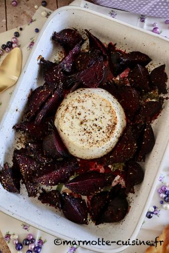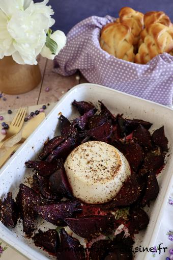 3/ Démouler la ricotta dans un joli plat passant au four et disposer les betteraves tout autour. Verser un filet d’huile d’olive sur la ricotta et parsemer avec le zaatar restant.