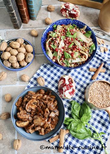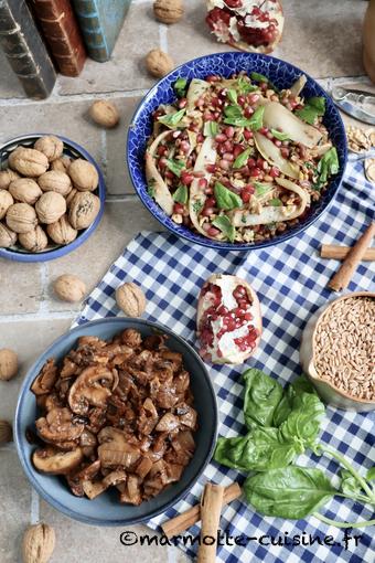 Salade d’épeautre aux endives grillées et à la grenade et Manitaria stifodo, le ragout de champignons au vin rouge (Temps de Carême #2)