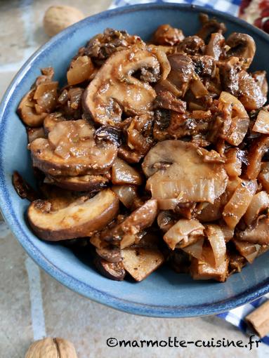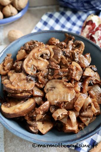 Pour accompagner cette salade, j’ai choisi de faire un ragoût de champignons au vin rouge. C’est la découverte du jour. J’ai beaucoup aimé même si là encore j’ai fait quelques modifications en fonction de ce que j’avais en stock. J’ai par exemple remplacé les oignons grelots par des oignons normaux que j’ai simplement émincés. Il faut dire que les oignons grelots ne courent pas les rues. Vous en trouverez chez Picard et en plus ils sont épluchés, ce qui est très pratique car ça doit prendre un temps fou. Pour revenir à la recette, ce mélange de textures et de saveurs est une belle découverte. Les champignons (bruns pour ma part) se marient très bien avec cette sauce au vin réduite au four. C’est une recette que je referai, notamment en accompagnement d’une viande.