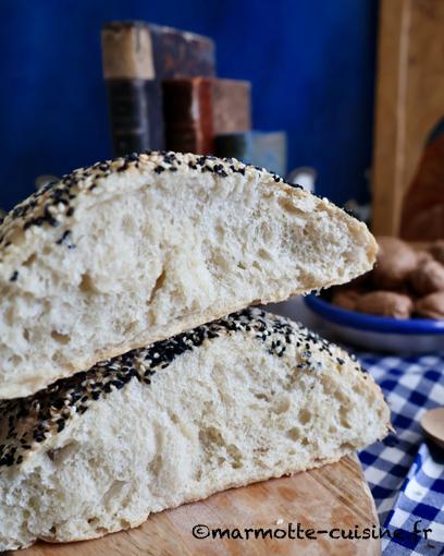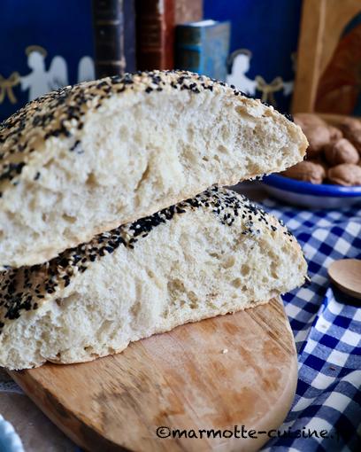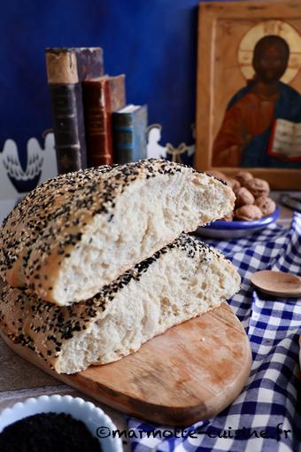 J’adore découvrir de nouvelles recettes de pain et forcément quand j’ai découvert ce pain chypriote, j’ai tout de suite eu envie de le tester, d’autant que j’avais quasiment tous les ingrédients en stock sauf l’anis. Le mastic et le mahaleb ne sont pas courants. Vous pouvez vous en passer bien qu’ils apportent une saveur particulière à ce pain. L’aspect campagnard de ce pain réside surtout dans sa croûte de graines. Si vous n’avez pas celles proposées dans la recette, utilisez celles que vous avez à la maison. Ce pain est très parfumé et moelleux. Pour moi, il appartient à la catégorie pain-gâteau. Il se consomme très facilement seul mais on peut aussi le proposer avec une soupe, une salade ou un assortiment de tartinades.